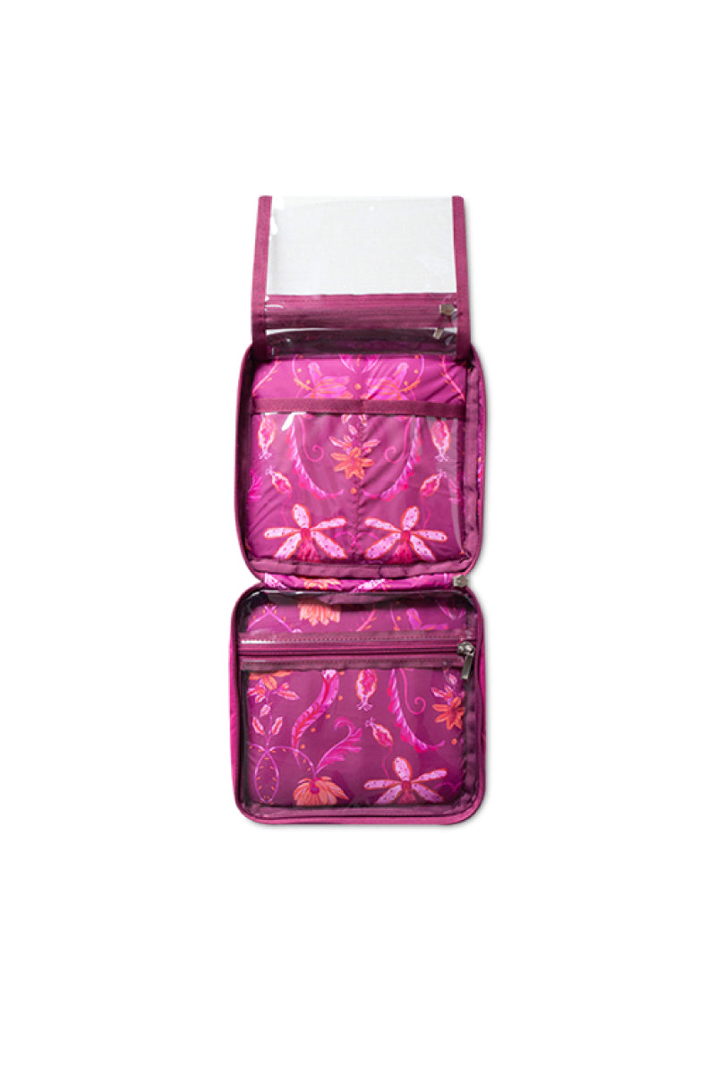 Organizador con múltiples compartimientos, ideal para empacar maquillaje, skincare o productos de aseo personal. Cuenta con un compartimiento grande, dos bolsillos y una cosmetiquera pequeña. Tiene cargadera en el exterior.
